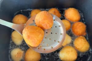 Der erste Fehler ist eine zu niedrige Temperatur. Dann saugen sich die Bällchen mit Frittieröl voll und schmecken schwer. Der zweite Fehler liegt bei zu hoher Temperatur. In diesem Fall sind sie außen dunkel, innen jedoch teigig.