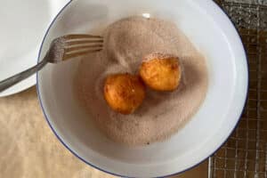 • Die Quarkbällchen in Zimtzucker wälzen.