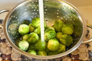 - Den Rosenkohl in ein Sieb gießen, mit kaltem Wasser abschrecken und halbieren.
