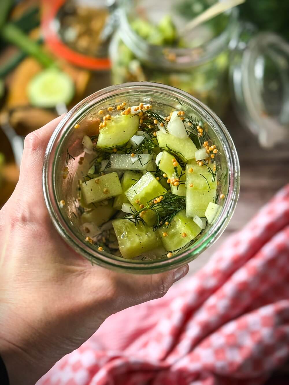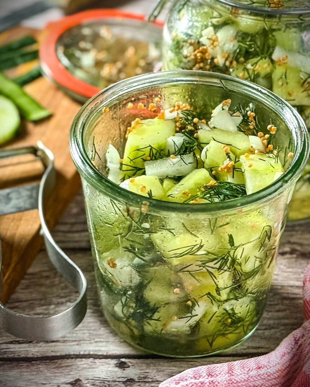 Besonders praktisch an diesem Gurkenrezept ist: Man braucht keinen Kochtopf, keinen heißen Sud im Einweckglas und auch keine spezielle Vorbereitung. Alles landet roh im Glas, wird durchgeschüttelt, und das war’s.