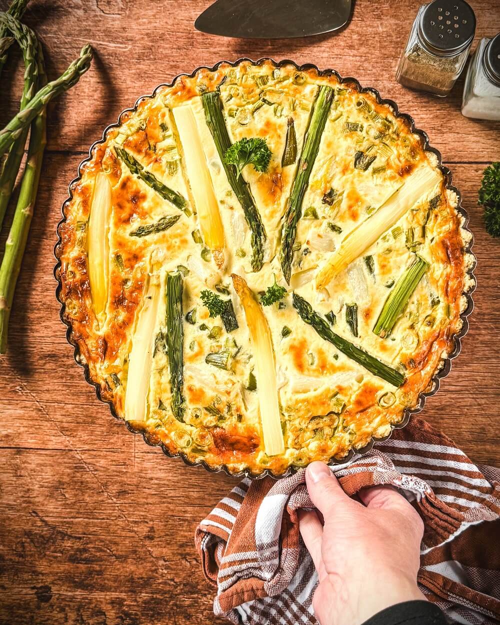 Spargelquiche mit weißem und grünem Spargel