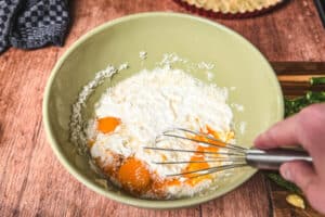 - Eier, Saure Sahne und Creme fraiche zusammen mit den Eiern, dem Parmesan sowie Salz, Pfeffer und Muskat in eine Schüssel geben und verrühren.