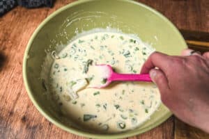 - Frühlingszwiebeln und Spargelstücke unter die Ei-Masse heben.
