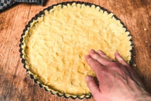 - Den Teig aus dem Kühlschrank nehmen und entweder ausrollen oder in der Quiche vorm verteilen und mit den Händen andrücken. Dabei die Ränder hochziehen.