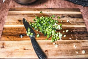 - Frühlingszwiebeln oder Lauch in feine Ringe schneiden, den Lauch in etwas Speiseöl andünsten.