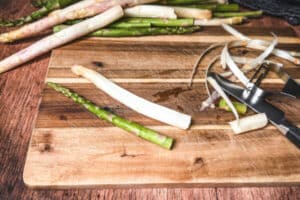 - Grünen Spargel nicht unbedingt schälen! Bei weißen Spargelstangen ist schälen empfohlen, weil es sonst „fasrig“ werden kann. Bitte mit dem Sparschäler vorgehen.