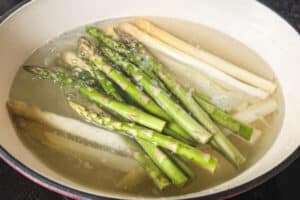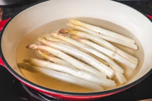 - Wasser in einen Topf geben, etwas Salz und Zucker hinzufügen und zuerst den weißen Spargel zirka 6 bis 8 Minuten je nach Dicke kochen lassen.