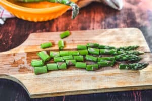 - Den Spargel gründlich waschen, die holzigen Enden entfernen und in mundgerechte Stücke schneiden.