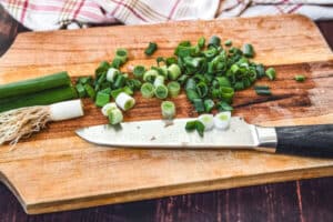 - Die Frühlingszwiebel in Ringe schneiden.
