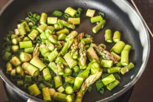- In einer Pfanne oder einem Topf das Olivenöl erhitzen und Spargelstücke andünsten. Die Frühlingszwiebeln zugeben und ebenfalls etwas andünsten.