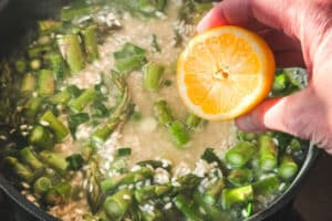 - Zitrone: Frischer Zitronensaft bringt eine leichte Säure ins Gericht und passt geschmacklich gut zum Spargel. Dadurch wirkt das Risotto angenehm frisch.