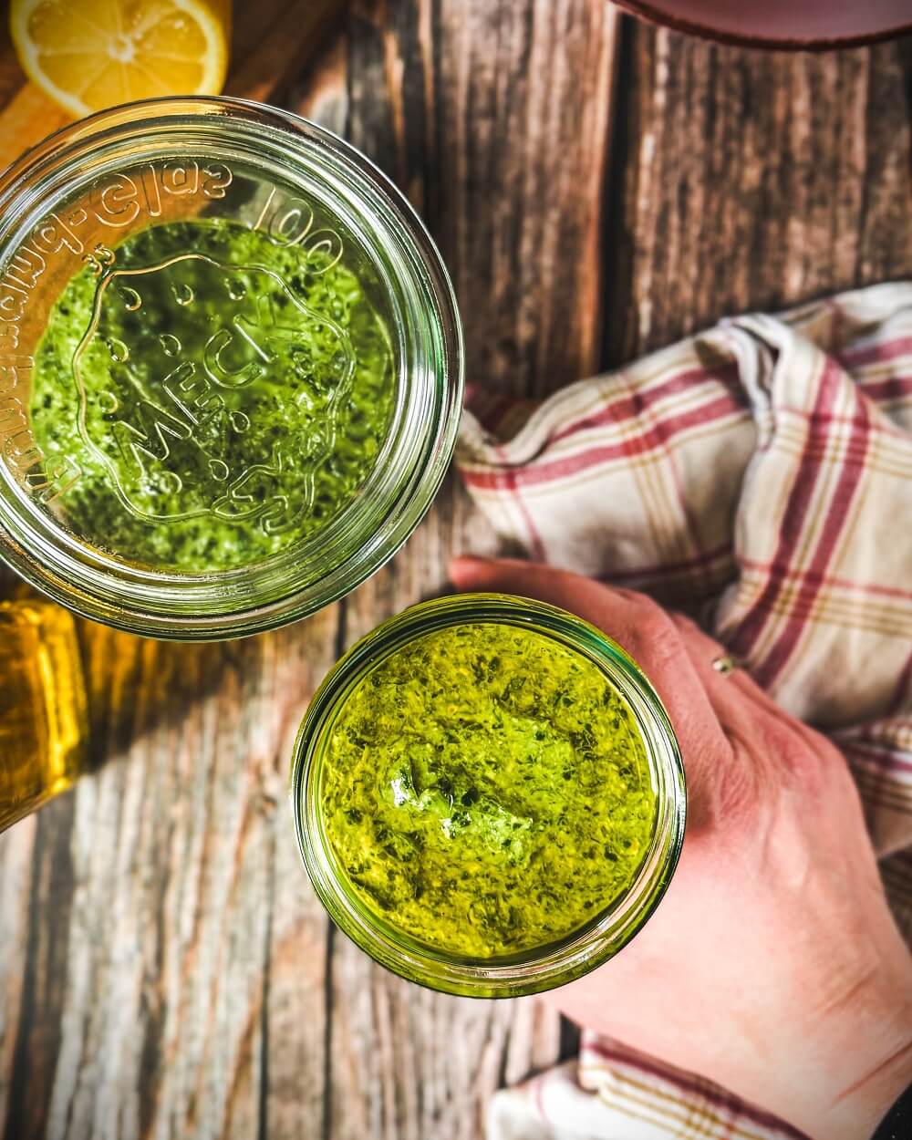 Unsauber gelagert: Ein Glas, das nicht sauber ist, verkürzt die Haltbarkeit. Die Oberfläche vom Spinat Pesto immer mit Olivenöl bedecken, damit kein Sauerstoff herankommt.