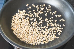 Zuerst stehen die Grundlagen an. Die Pinienkerne kommen in die Pfanne und bekommen dort eine leichte Bräune, danach dürfen sie in Ruhe abkühlen.