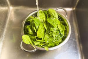 • Während die Pinienkerne abkühlen, den Spinat gründlich waschen.