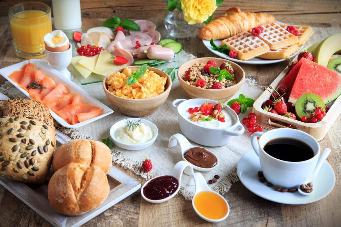 Ein abwechslungsreiches Buffet enthält Brot, Brötchen, Käse, Wurst, Obst, Eiergerichte und verschiedene Getränke wie Kaffee oder Tee.