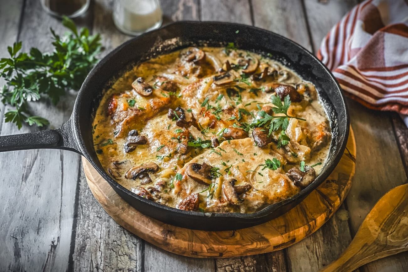 Dieses Schnitzelpfanne Rezept mit Champignons kommt extra sahnig-cremig daher. Aus dem Backofen und mit Käse überbacken.