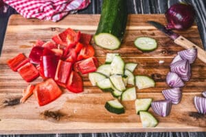- Die Paprika entkernen und in Stücke schneiden. Zucchini und rote Zwiebeln ebenfalls in ähnlich große Stücke schneiden, damit alles gleichmäßig gart.