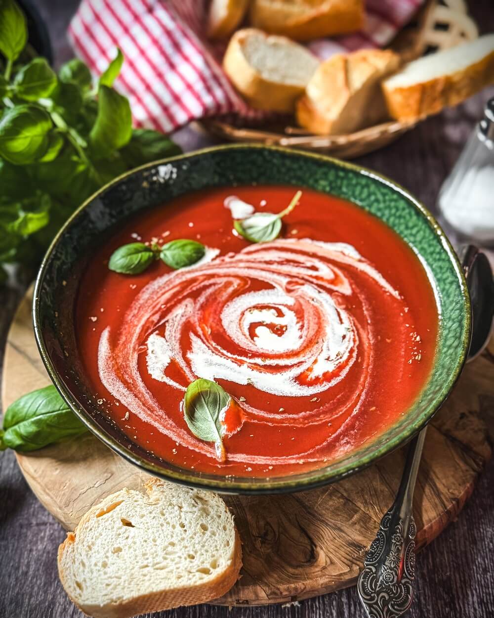 Sehr gut passen ein Klecks Schmand, saure Sahne oder Crème fraîche, die die Suppe cremiger, milder und zur Tomatencremesuppe machen. Frische Kräuter wie Basilikum bringen Frische, während Parmesan, Croûtons oder ein Schuss Olivenöl zusätzliche Tiefe geben. Wer es würziger mag, kann etwas Chili, gerösteten Knoblauch oder frisch gemahlenen Pfeffer ergänzen.
