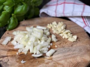 - Zwiebeln und Knoblauch schälen und fein würfeln.
