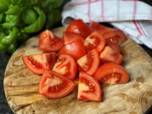 - Die Tomaten waschen, je nach Größe vierteln oder achteln und den harten Strunk entfernen.
