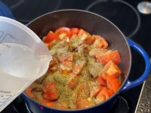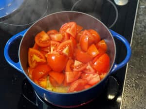 - Die Tomatenstücke hinzufügen und bei hoher Hitze kräftig anbraten. Dabei ständig umrühren, damit nichts anbrennt und nicht immer dieselben Stücke am Topfboden liegen.